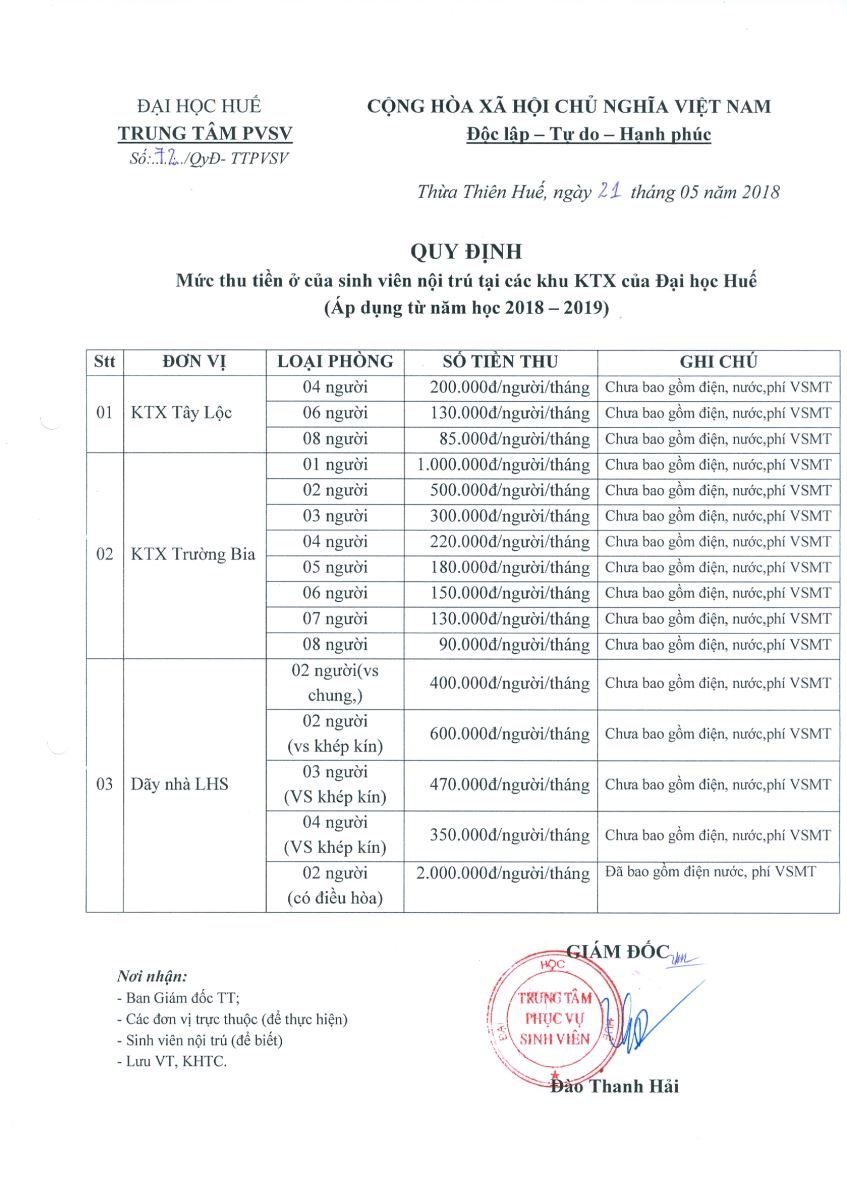 - Địa điểm đón tiếp, làm thủ tục nhận chỗ ở: Văn phòng Ban quản lý KTX Đống Đa, số 32 Lê Hồng Phong, TP Huế.