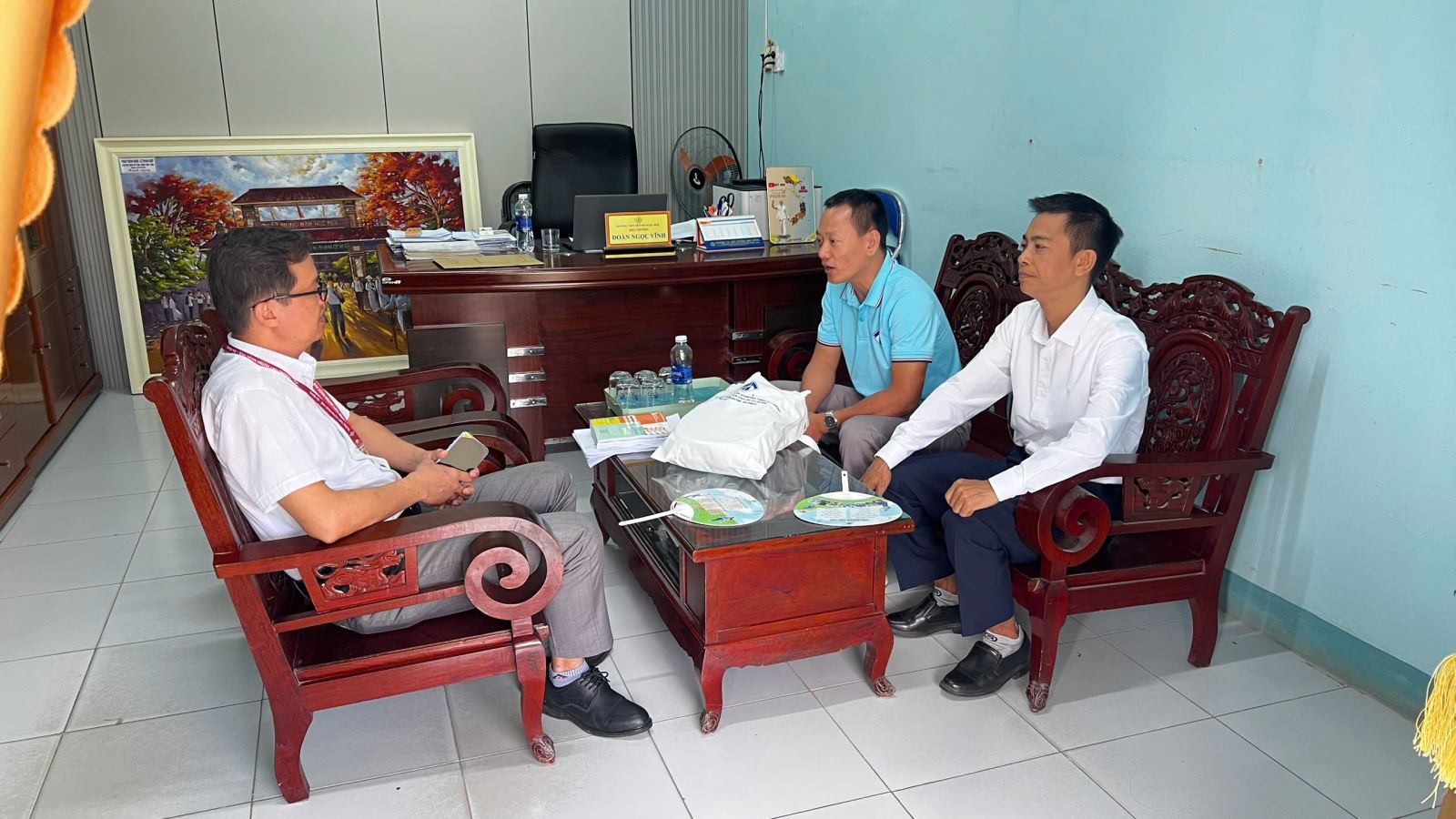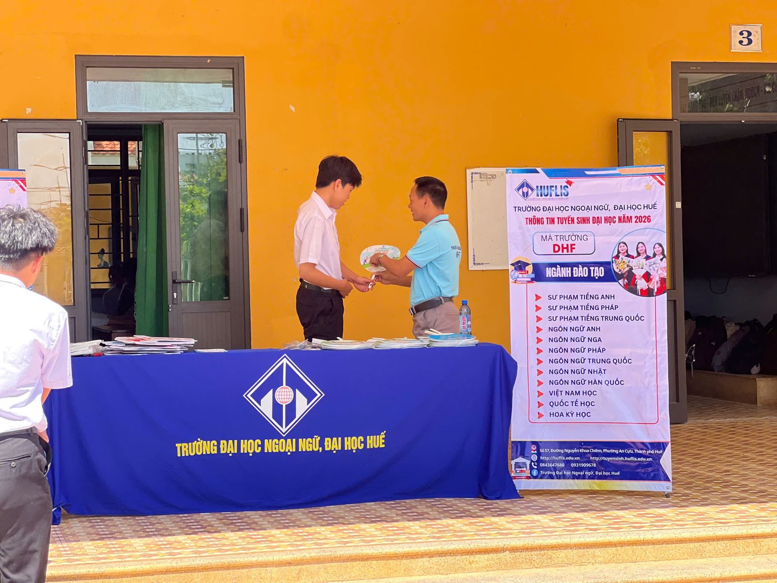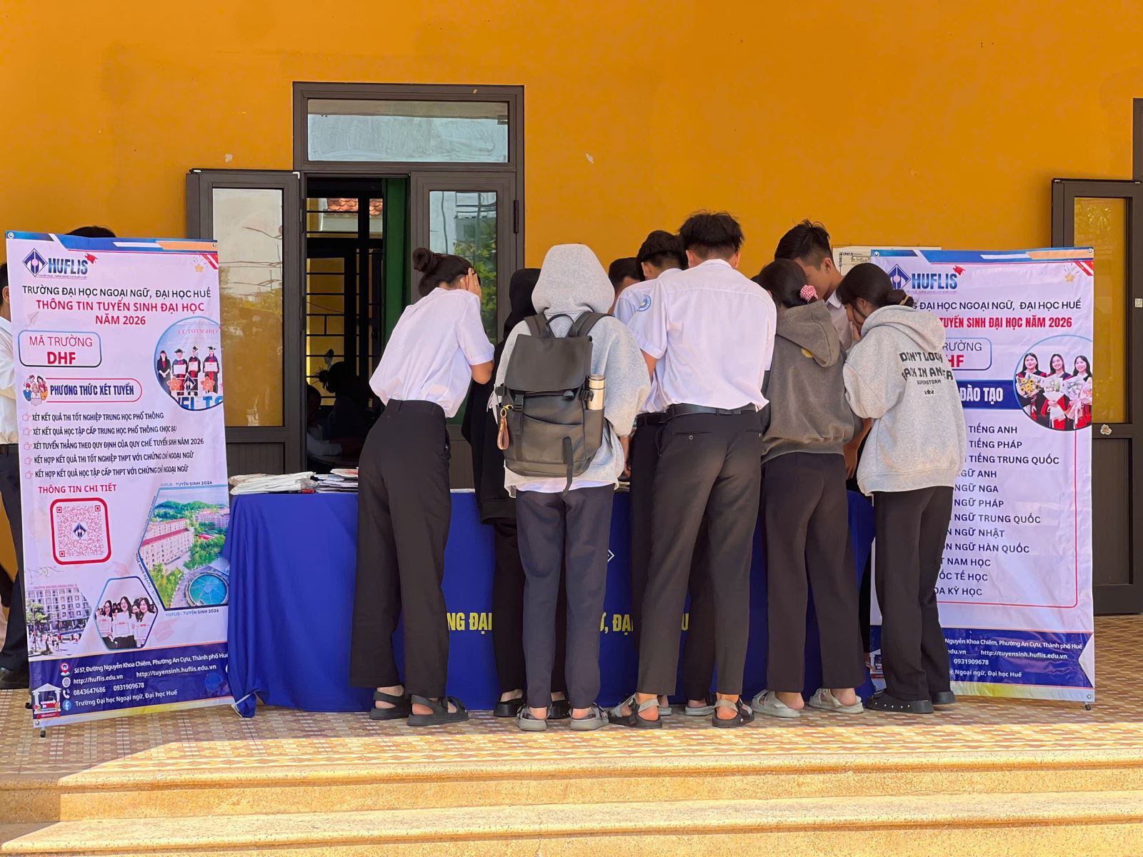 Bên cạnh đó, Đoàn công tác cũng đã tổ chức các hoạt động gặp gỡ, giao lưu trực tiếp với học sinh tại nhiều trường THPT. Bàn tư vấn được bố trí ngay tại khuôn viên trường, tạo điều kiện thuận lợi để học sinh tiếp cận thông tin một cách nhanh chóng và hiệu quả. Tại đây, học sinh đã được giải đáp chi tiết các thắc mắc liên quan đến ngành học, định hướng nghề nghiệp, cũng như môi trường học tập tại Trường Đại học Ngoại ngữ, Đại học Huế.