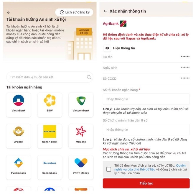 Bước 5: Chọn tài khoản ngân hàng hoặc tài khoản mobile money của mình để nhận tiền an sinh xã hội được hỗ trợ. Sau đó tiếp tục điền thông tin tài khoản ngân hàng mà mình đã chọn để liên kết như hình bên dưới.