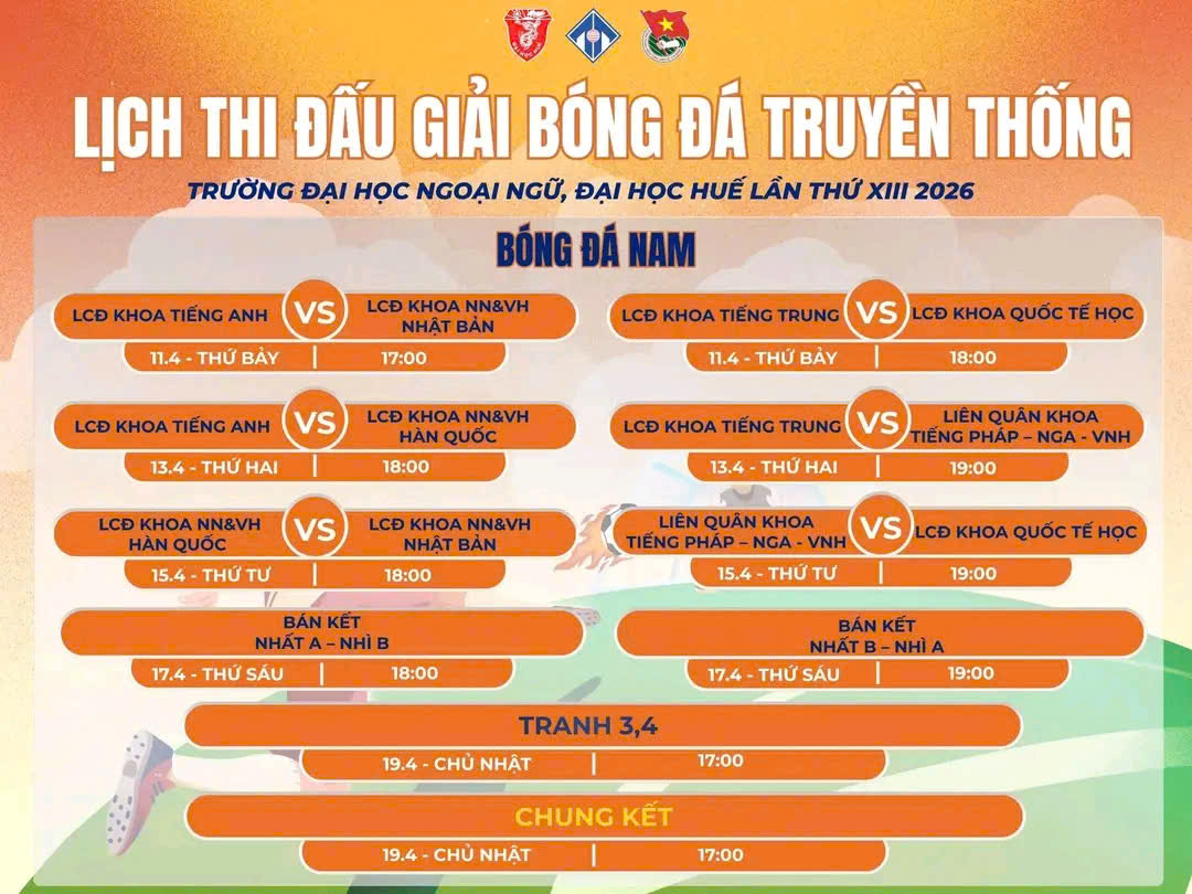 Các trận đấu của vòng bảng diễn ra từ ngày 11 đến ngày 15 tháng 4 năm 2026, các trận chúng kết diễn ra trong ngày 19 tháng 4 năm 2026 tại Sân bóng đá Trường Đại học Luật, Đại học Huế.