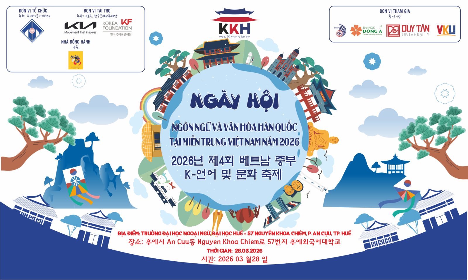 Thực hiện Kế hoạch số 109/KH-ĐHNN ngày 06 tháng 02 năm 2026 của Hiệu trưởng Trường Đại học Ngoại ngữ, Đại học Huế về việc tổ chức Ngày hội Ngôn ngữ và Văn hóa Hàn Quốc tại miền Trung năm 2026. Trường triển khai cho sinh viên đăng kí tham gia với các nội dung sau: