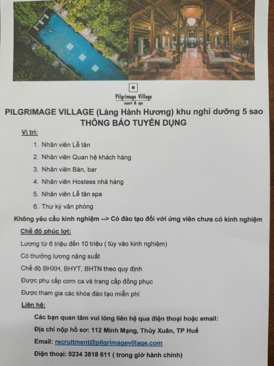 PILGRIMAGE VILLAGE (LÀNG HÀNH HƯƠNG) THÔNG BÁO TUYỂN DỤNG NHÂN SỰ