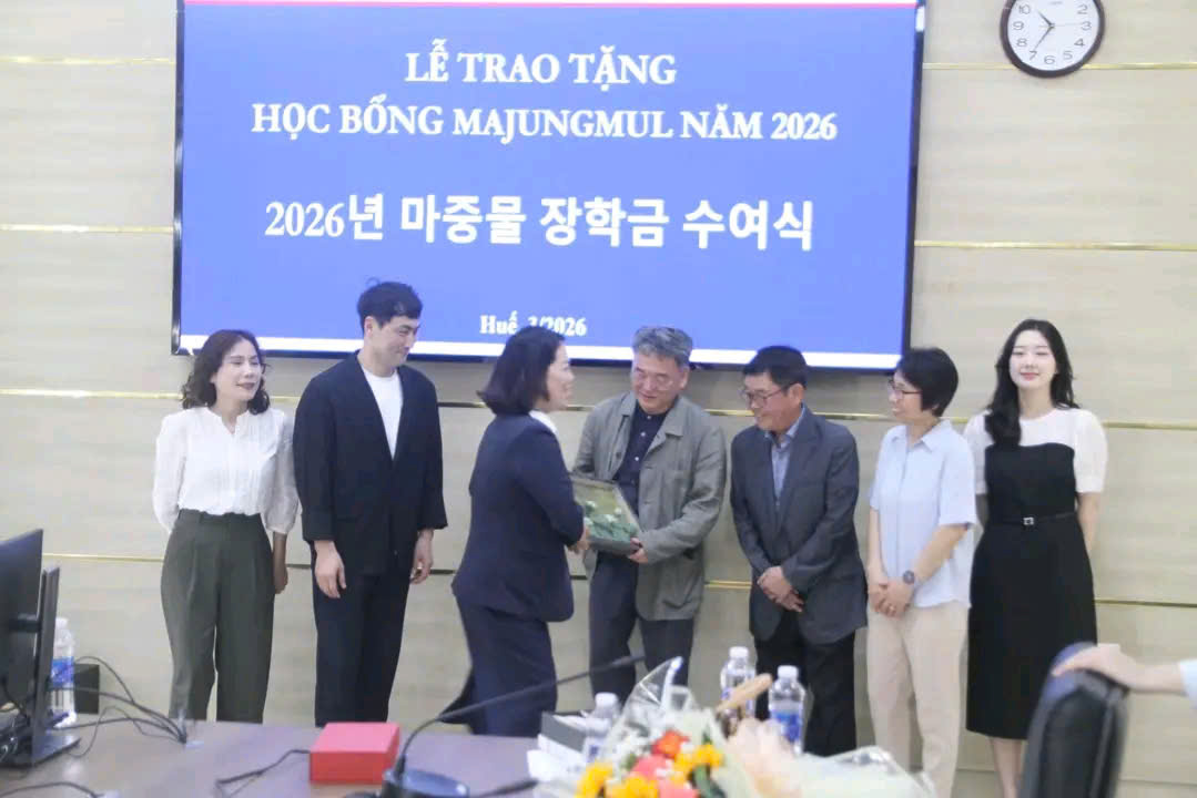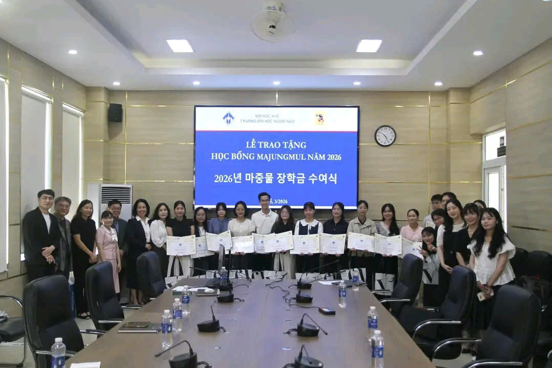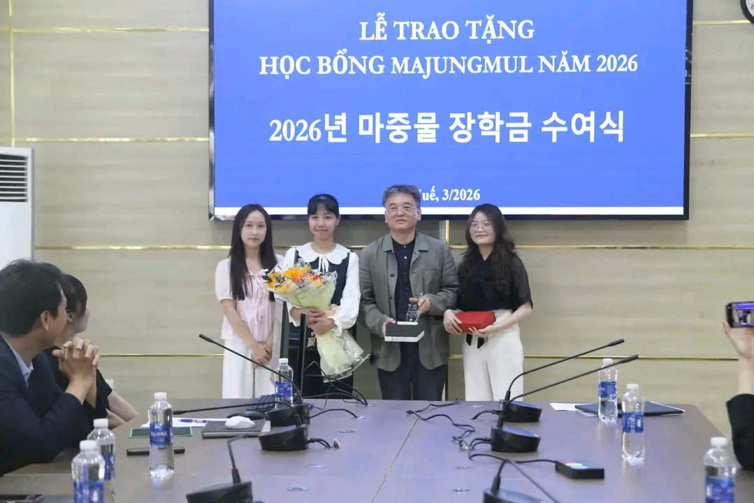 Sáng ngày 27/03/2026, tại Phòng D103, Thư viện, Trường Đại học Ngoại ngữ, Đại học Huế tổ chức Lễ trao học bổng năm học 2025 - 2026 do Quỹ học bổng Majungmul tài trợ cho sinh viên xuất Ngành Ngôn ngữ Hàn Quốc.