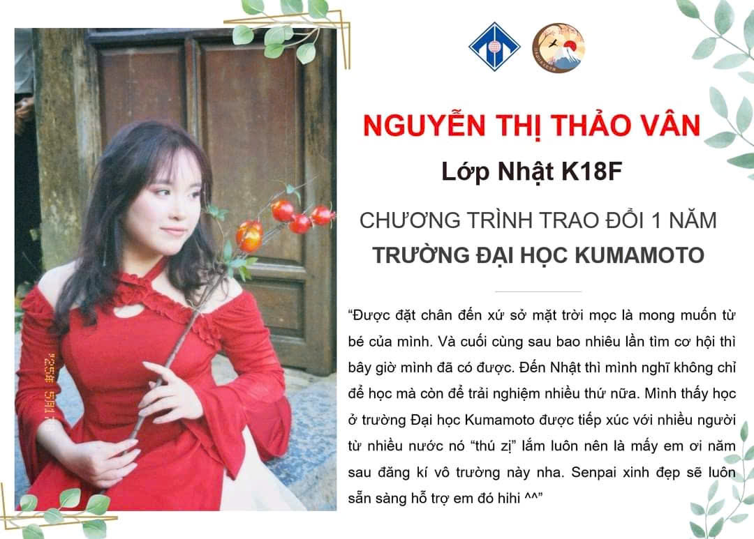 Trường Đại học Ngoại ngữ, Đại học Huế tuyên dương sinh viên Nguyễn Thị Thảo Vân, lớp Nhật K18F, Khoa NN&VH Nhật Bản đã xuất sắc giành được học bổng trao đổi 1 năm tại Trường Đại học Kumamoto [Nhật Bản]